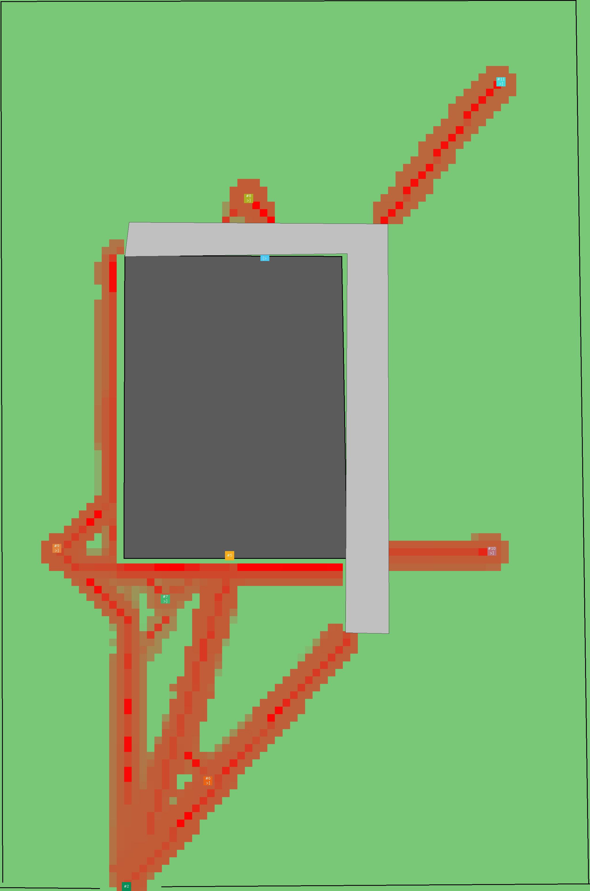 Красным цветом показаны места, где, вероятнее всего, появятся стихийные тропы..