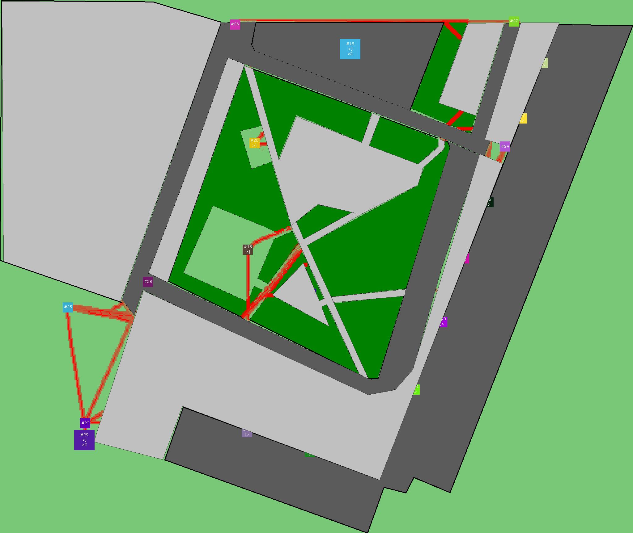 Красным цветом показаны места, где, вероятнее всего, появятся стихийные тропы..