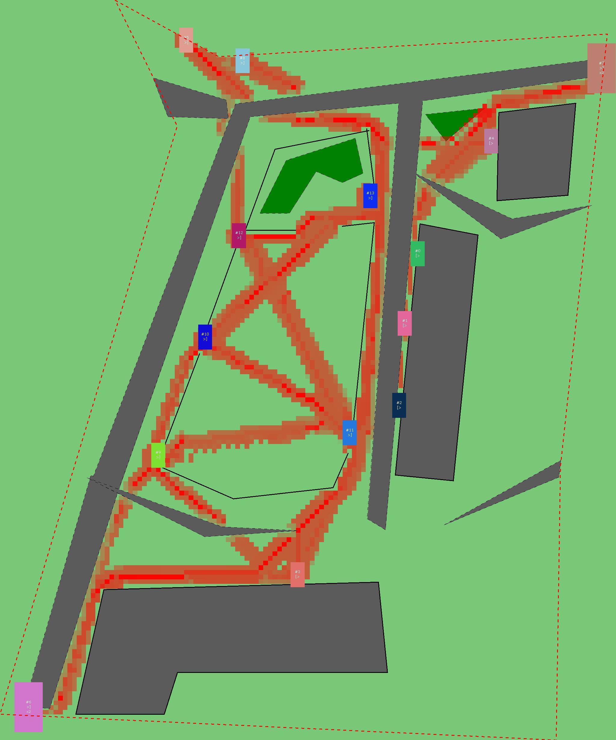 Красным цветом показаны места, где, вероятнее всего, появятся стихийные тропы..