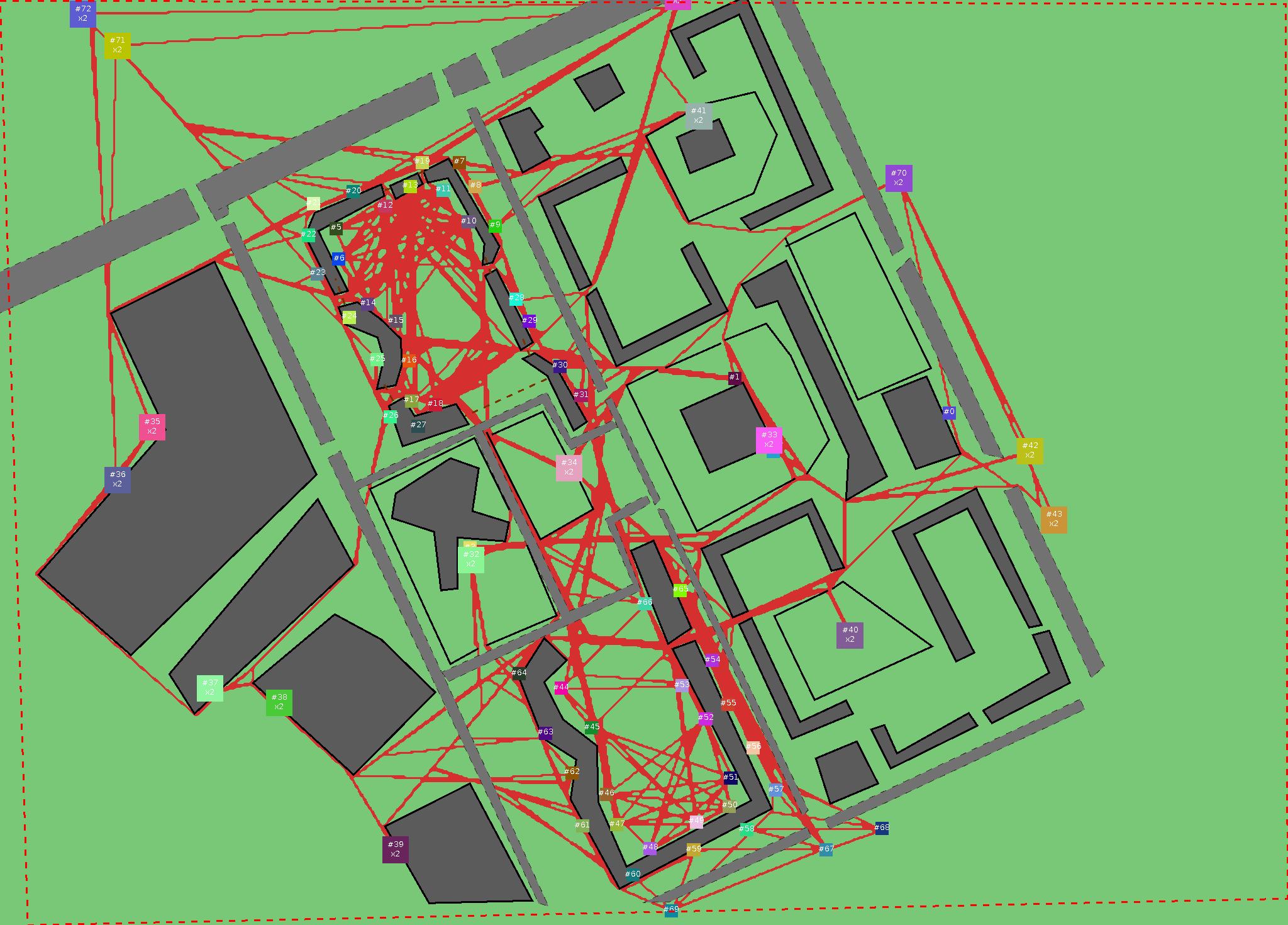 Красным цветом показаны места, где, вероятнее всего, появятся стихийные тропы..