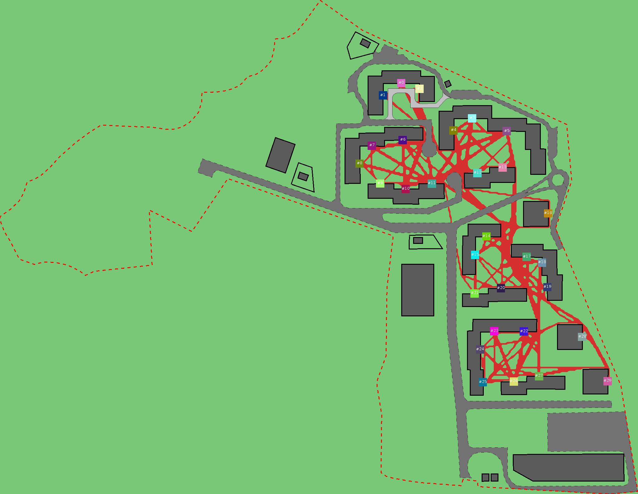 Красным цветом показаны места, где, вероятнее всего, появятся стихийные тропы..