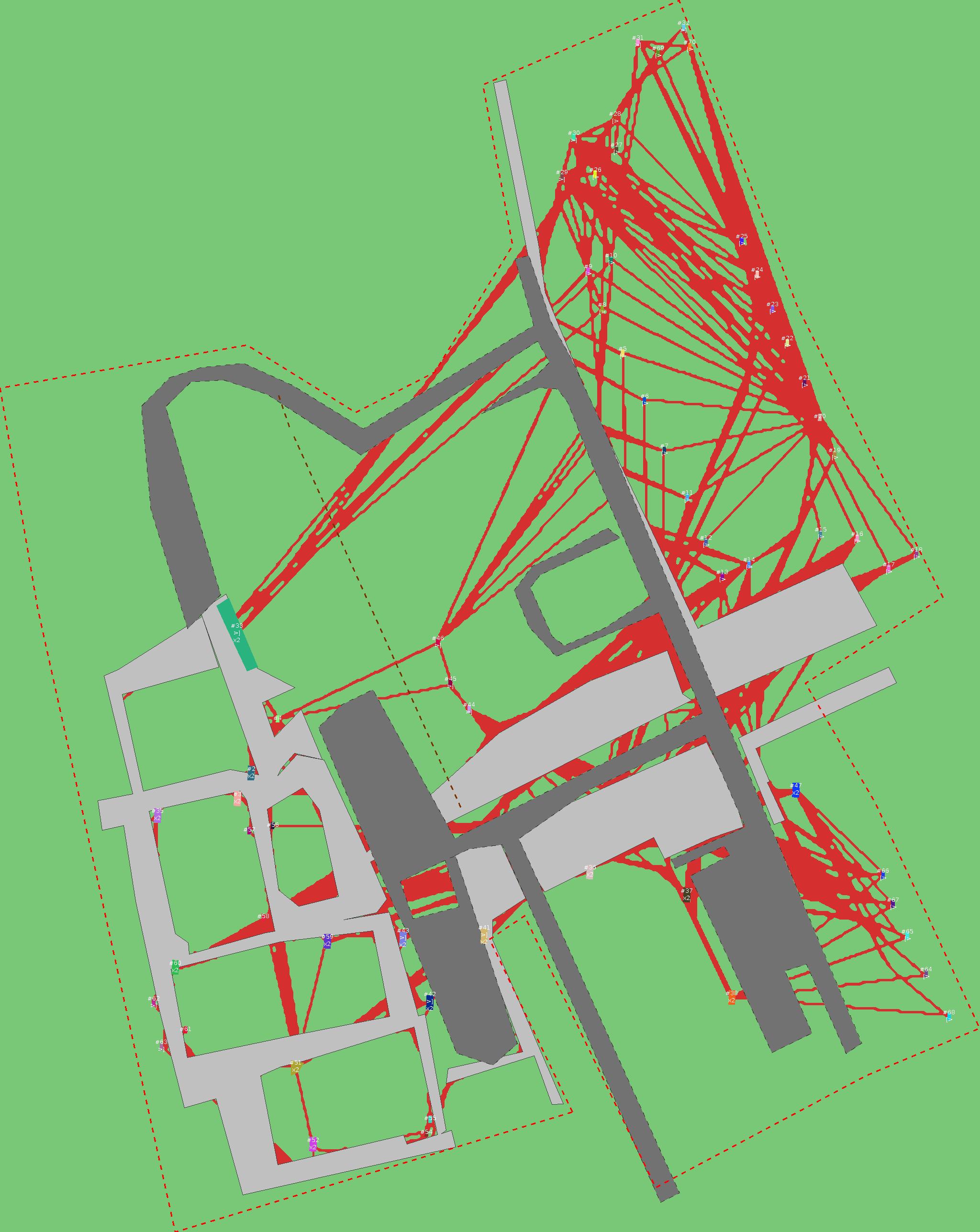 Красным цветом показаны места, где, вероятнее всего, появятся стихийные тропы..
