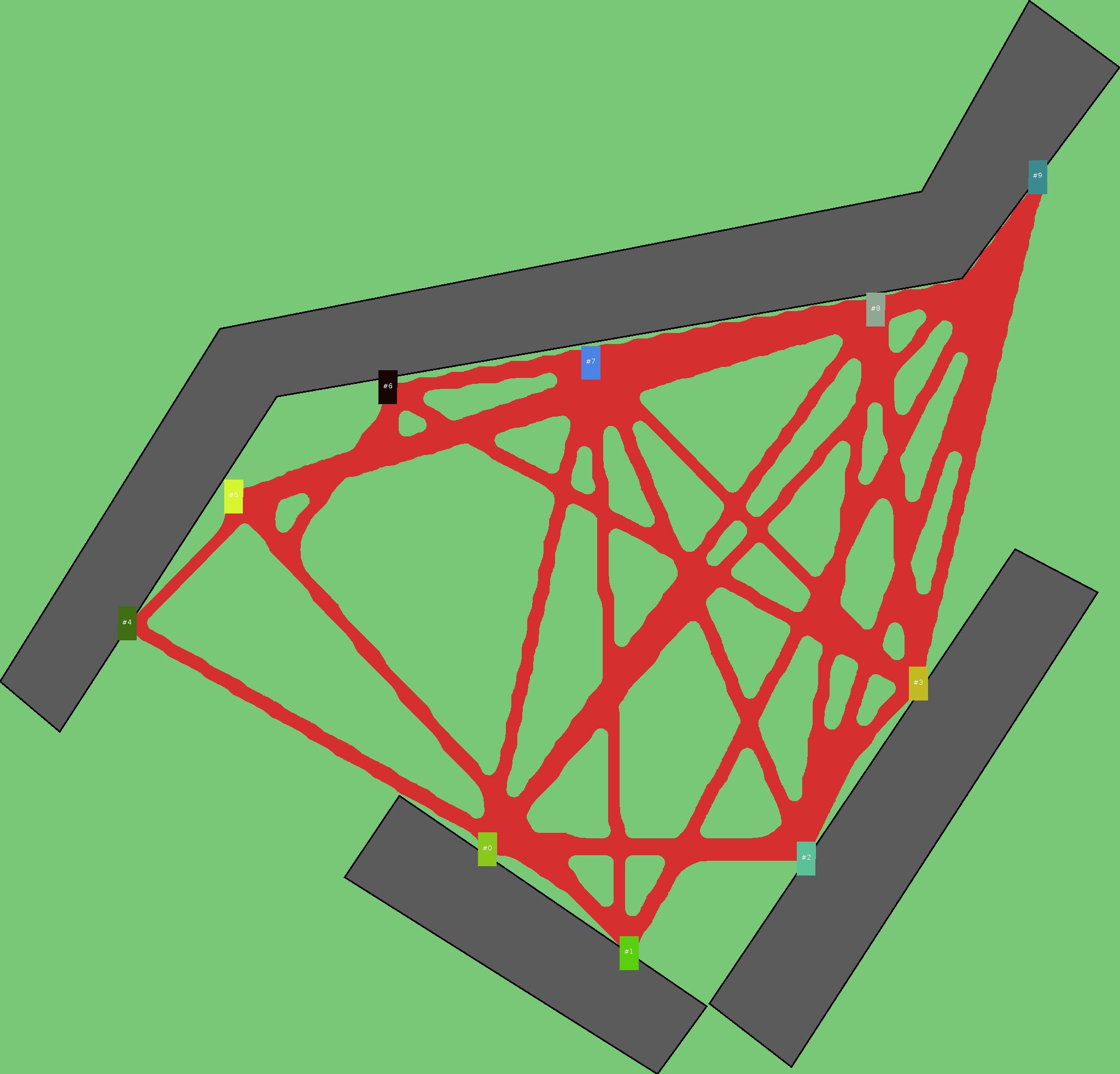 Красным цветом показаны места, где, вероятнее всего, появятся стихийные тропы..